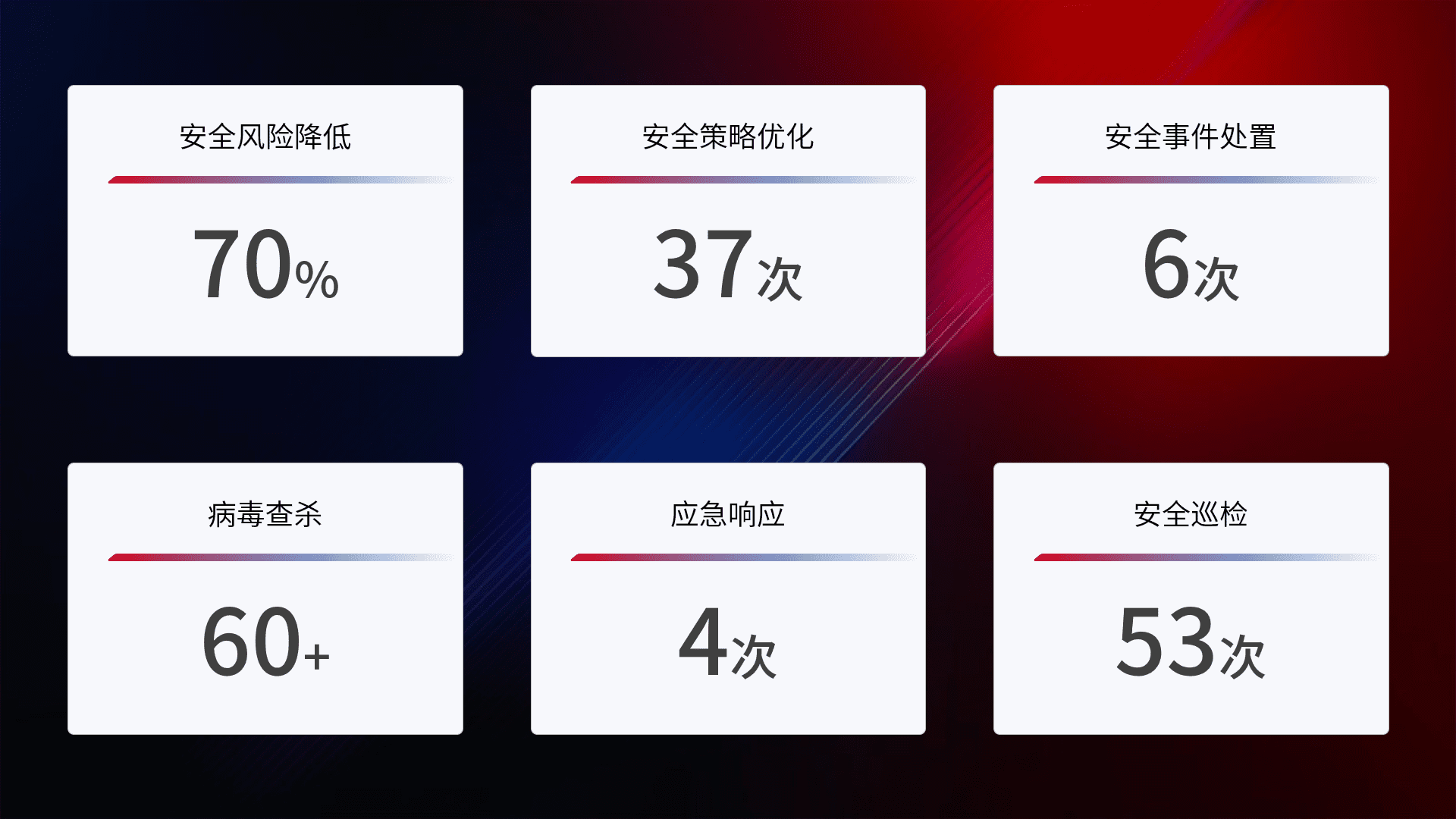 提供全面的安全事件报告体系,,,包括处置报告、、周报、、季度和年度总结,,,结合持续监控,,,,帮助客户深入了解网络安全状况。。。。